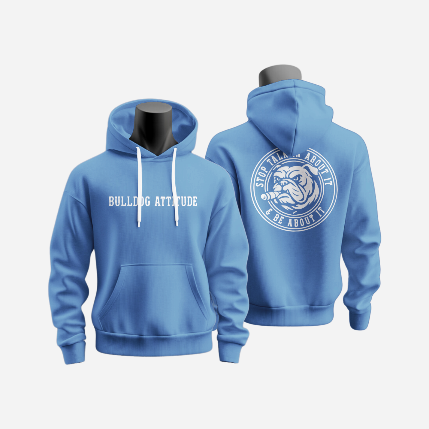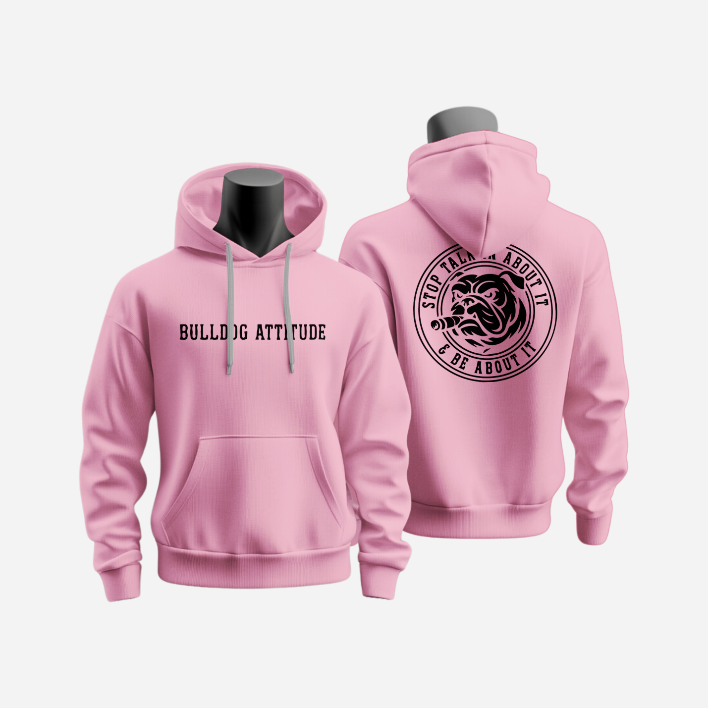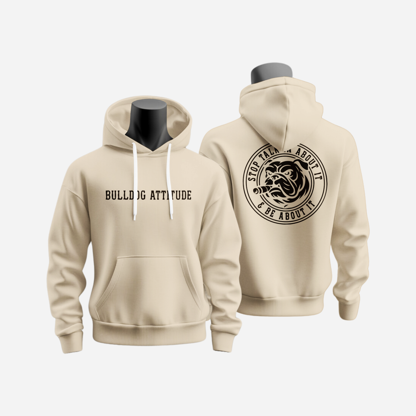 Designed for those who believe in action, this hoodie features a strong front print reading “Bulldog Attitude” and a detailed bulldog illustration on the back with the slogan “Stop Talkin’ About It & Be About It.”